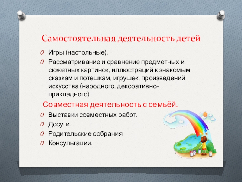 привлечь родителей к совместным мероприятиям, к оформлению предметно-развивающей среды,