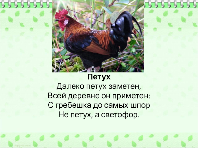 Петух Далеко петух заметен,Всей деревне он приметен:С гребешка до самых шпорНе петух, а светофор.