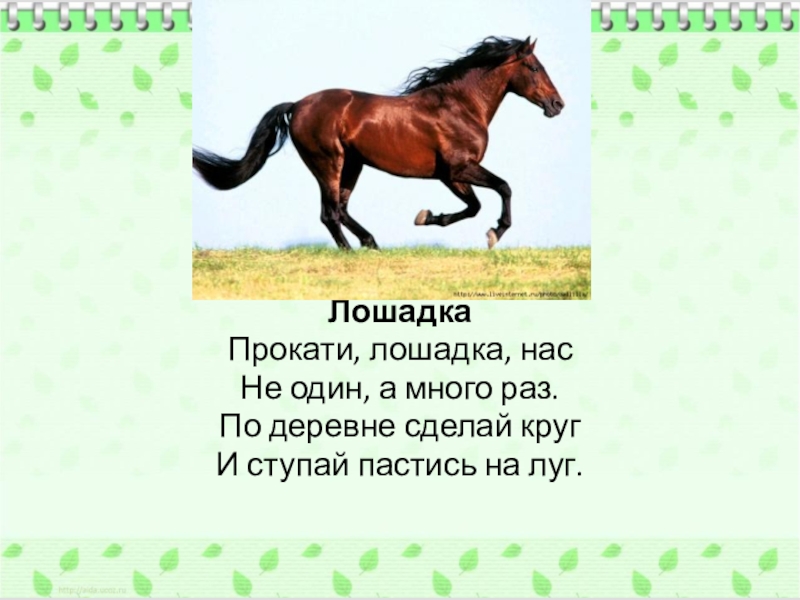ЛошадкаПрокати, лошадка, насНе один, а много раз.По деревне сделай кругИ ступай пастись на луг.