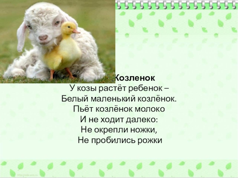 КозленокУ козы растёт ребенок –Белый маленький козлёнок.Пьёт козлёнок молокоИ