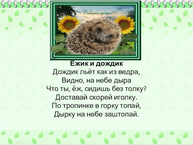 Ёжик и дождикДождик льёт как из ведра,Видно, на небе дыраЧто ты, ёж, сидишь без толку?Доставай скорей иголку.По