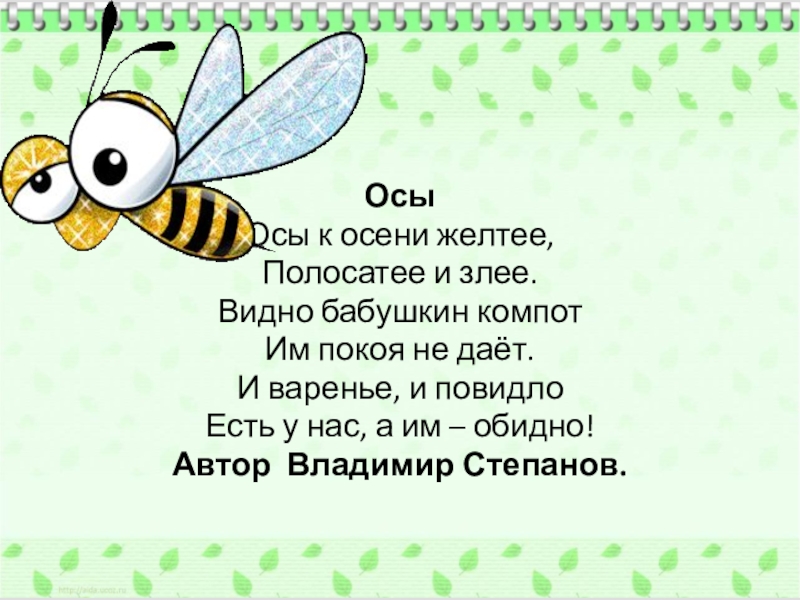 Осы Осы к осени желтее,Полосатее и злее.Видно бабушкин компотИм покоя не даёт.И варенье, и повидлоЕсть у нас,