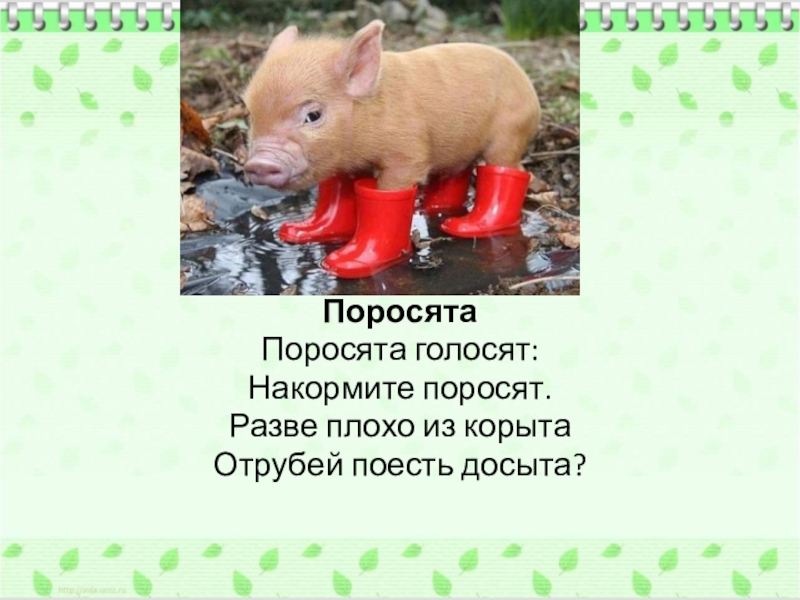 Поросята Поросята голосят:Накормите поросят.Разве плохо из корытаОтрубей поесть досыта?