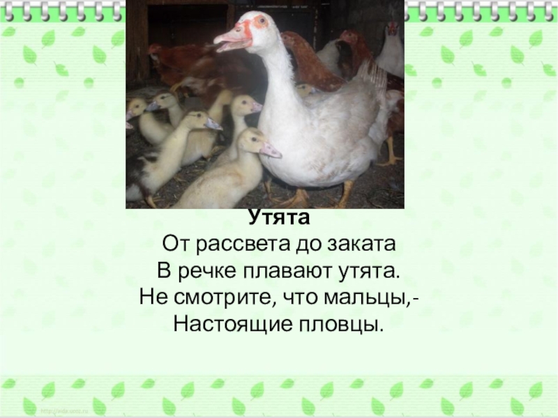 Утята От рассвета до закатаВ речке плавают утята.Не смотрите, что мальцы,-Настоящие пловцы.