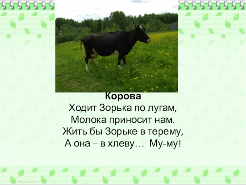 Корова Ходит Зорька по лугам,Молока приносит нам.Жить бы Зорьке в терему,А она – в хлеву… Му-му!