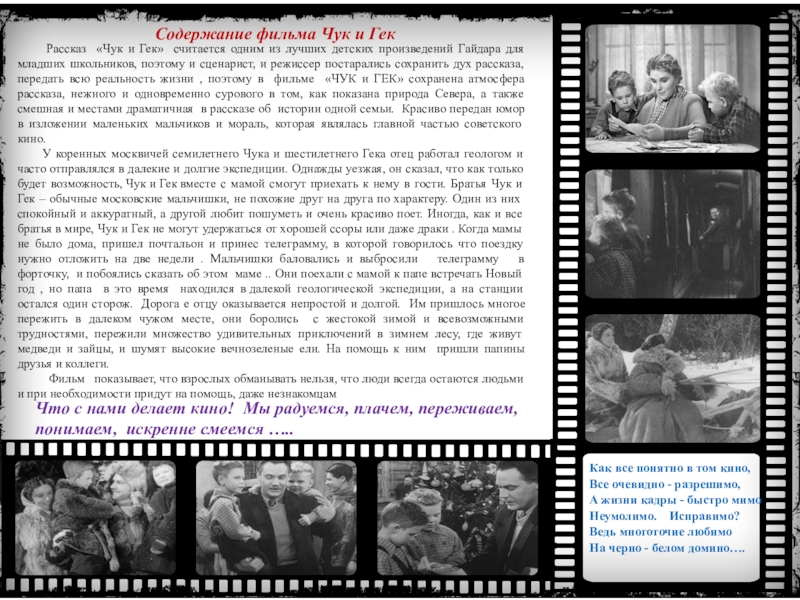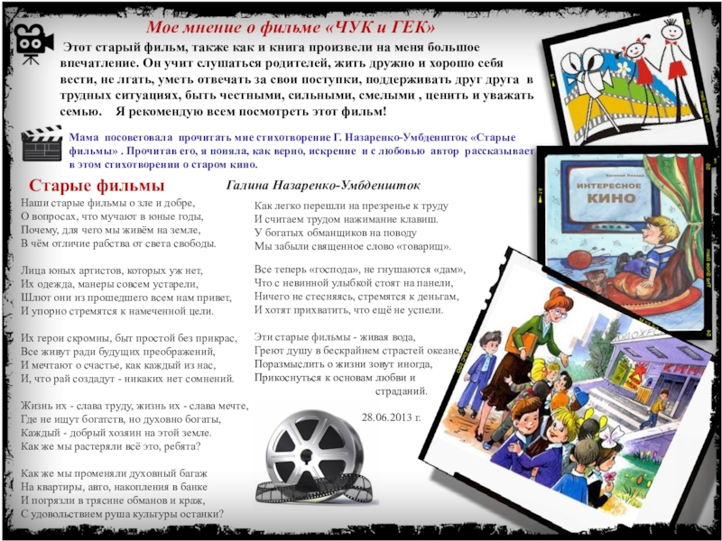 Мама посоветовала прочитать мне стихотворение Г. Назаренко-Умбденшток «Старые фильмы» . Прочитав его, я поняла, как верно, искренне и с любовью автор рассказывает в этом стихотворении о старом кино.