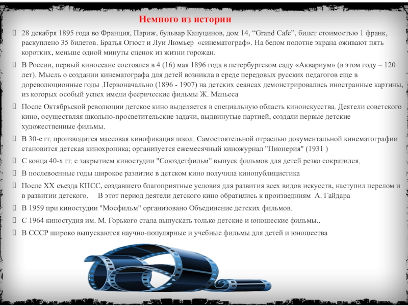 КИНО – самое молодое из искусств, но оно давно уже признано самым важным из искусств, и оно действительно ориентирует многих людей в их жизни.