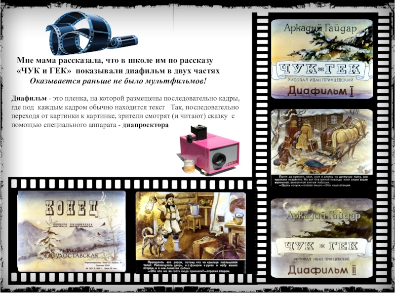 Диафильм - это пленка, на которой размещены последовательно кадры, где под каждым кадром обычно находится текст Так, последовательно переходя от картинки к картинке, зрители смотрят (и читают) сказку с помощью специального аппарата - диапроектора