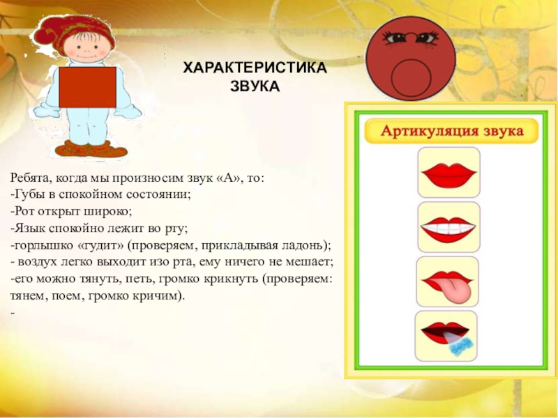 ХАРАКТЕРИСТИКА ЗВУКА Ребята, когда мы произносим звук «А», то:-Губы в спокойном состоянии;-Рот открыт широко;-Язык спокойно лежит во
