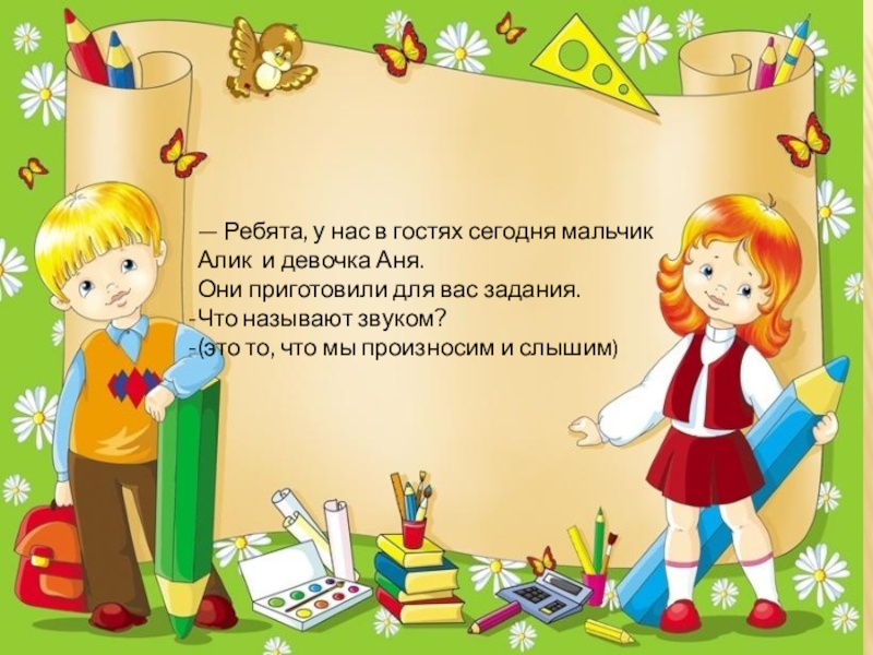 — Ребята, у нас в гостях сегодня мальчик Алик и девочка Аня. Они приготовили для вас задания.Что называют звуком? (это то, что мы произносим и слышим)