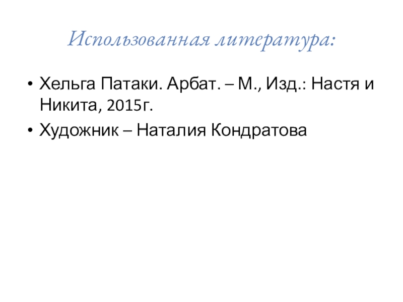 Использованная литература:Хельга Патаки. Арбат. – М., Изд.: Настя и Никита, 2015г.Художник – Наталия Кондратова