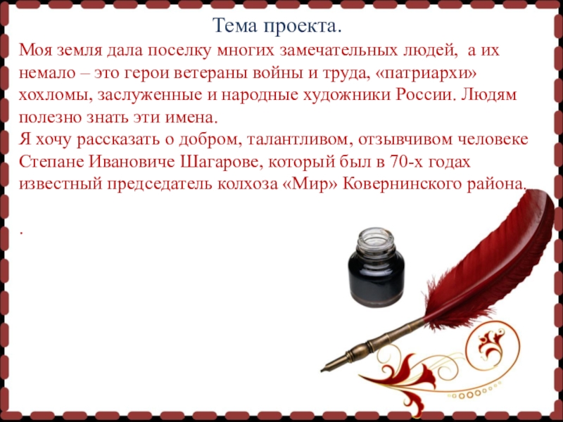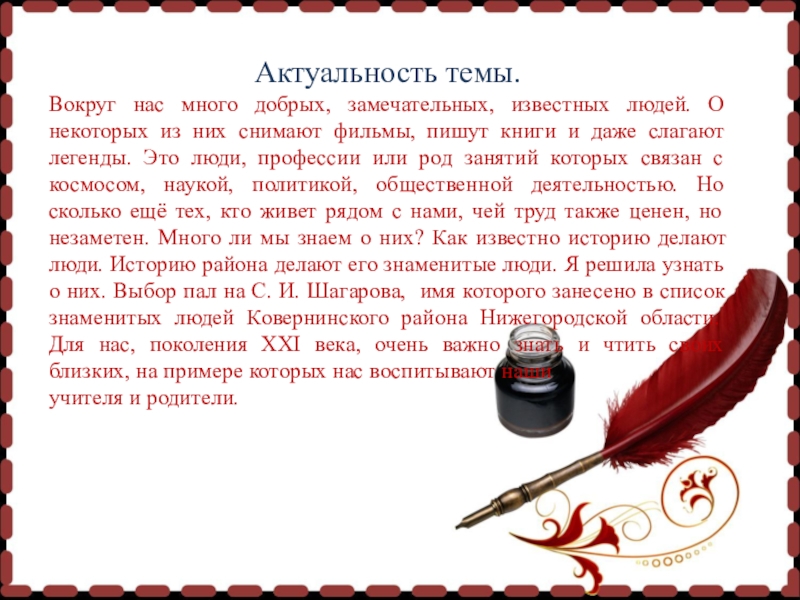 них снимают фильмы, пишут книги и даже слагают легенды. Это люди, профессии или род занятий которых связан с космосом, наукой, политикой, общественной деятельностью. Но сколько ещё тех, кто живет рядом с нами, чей труд также ценен, но незаметен. Много ли мы знаем о них? Как известно историю делают люди. Историю района делают его знаменитые люди. Я решила узнать о них. Выбор пал на С. И. Шагарова, имя которого занесено в список знаменитых людей Ковернинского района Нижегородской области. Для нас, поколения XXI века, очень важно знать и чтить своих близких, на примере которых нас воспитывают наши