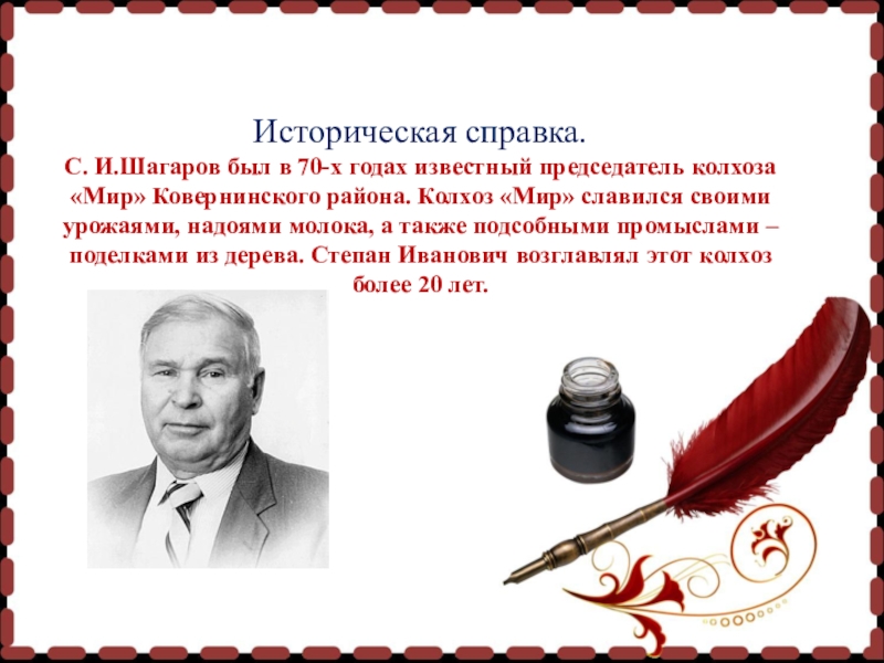 Я хочу рассказать о добром, талантливом, отзывчивом человеке Степане Ивановиче Шагарове, который был в 70-х годах известный председатель колхоза «Мир» Ковернинского района.