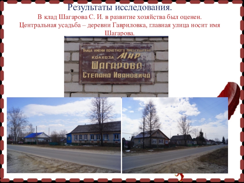 Центральная усадьба – деревни Гавриловка, главная улица носит имя Шагарова.