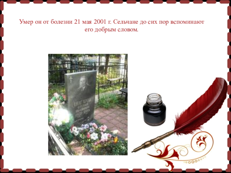 Слайд 10Умер он от болезни 21 мая 2001 г. Сельчане до сих