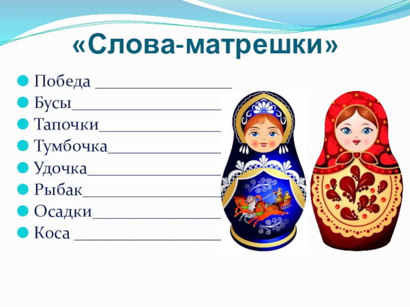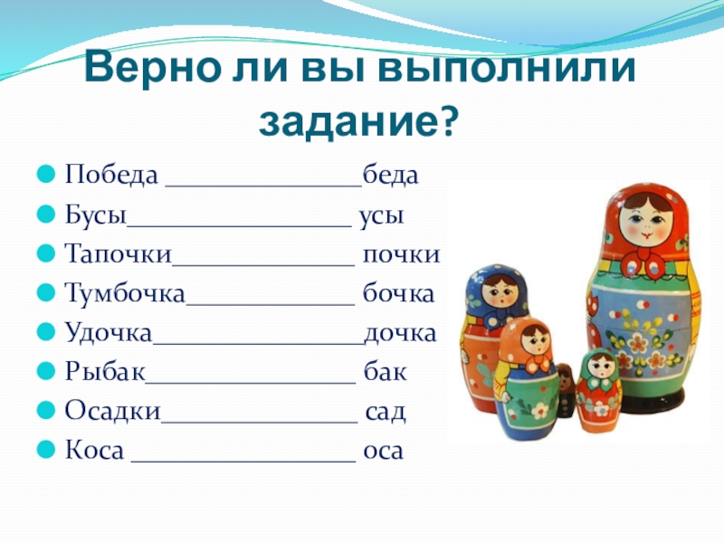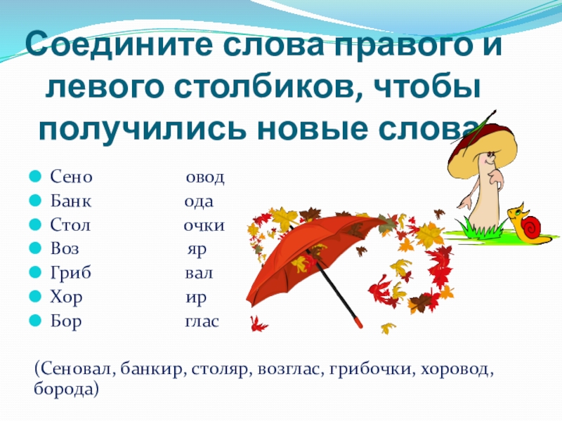 (Сеновал, банкир, столяр, возглас, грибочки, хоровод, борода)