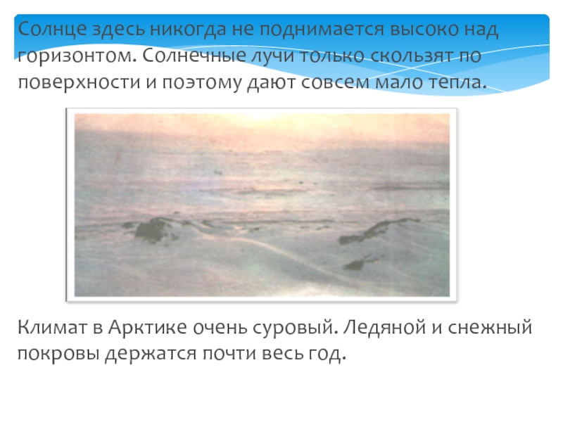 Солнце здесь никогда не поднимается высоко над горизонтом. Солнечные лучи только скользят по поверхности и поэтому дают совсем мало тепла.