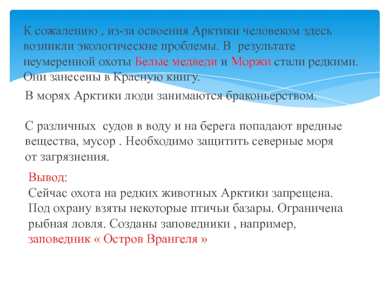 Сейчас охота на редких животных Арктики запрещена. Под охрану взяты некоторые птичьи базары. Ограничена рыбная ловля. Созданы заповедники , например, заповедник « Остров Врангеля »