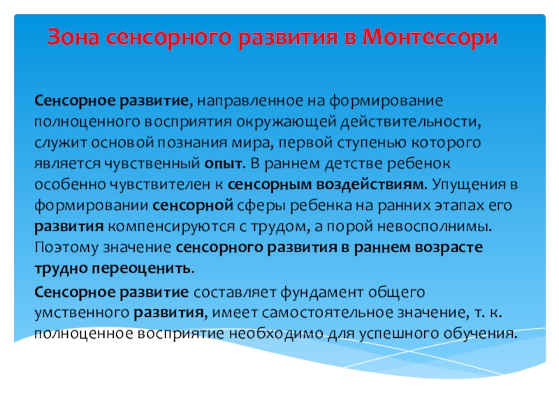 Сенсорное развитие составляет фундамент общего умственного развития, имеет самостоятельное значение, т. к. полноценное восприятие необходимо для успешного обучения.