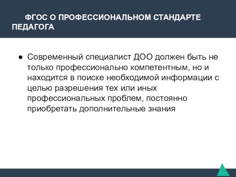 Современный специалист ДОО должен быть не только профессионально компетентным, но и находится в поиске необходимой информации с целью разрешения тех или иных профессиональных проблем, постоянно приобретать дополнительные знания