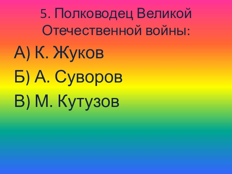 5. Полководец Великой Отечественной войны:А) К. ЖуковБ) А. СуворовВ) М. Кутузов