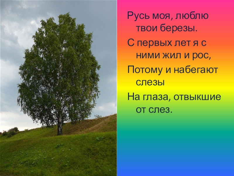 Русь моя, люблю твои березы.С первых лет я с ними жил и рос,Потому и набегают слезыНа глаза,