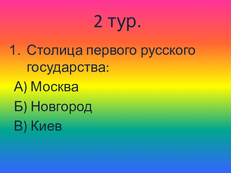 2 тур. Столица первого русского государства:А) МоскваБ) НовгородВ) Киев