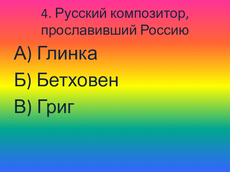 4. Русский композитор, прославивший Россию А) ГлинкаБ) БетховенВ) Григ