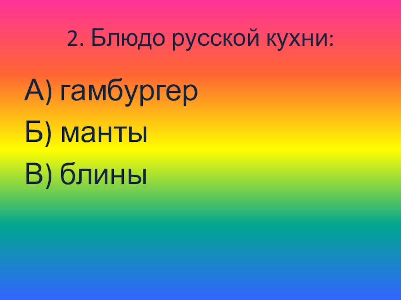 2. Блюдо русской кухни:А) гамбургер Б) мантыВ) блины