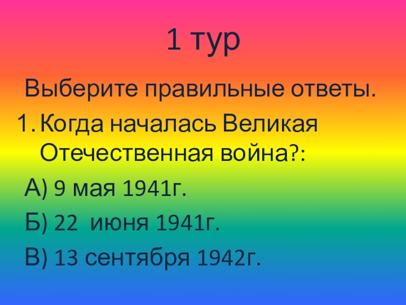 1 турВыберите правильные ответы.Когда началась Великая Отечественная война?:А) 9 мая 1941г.Б) 22 июня 1941г.В) 13 сентября 1942г.