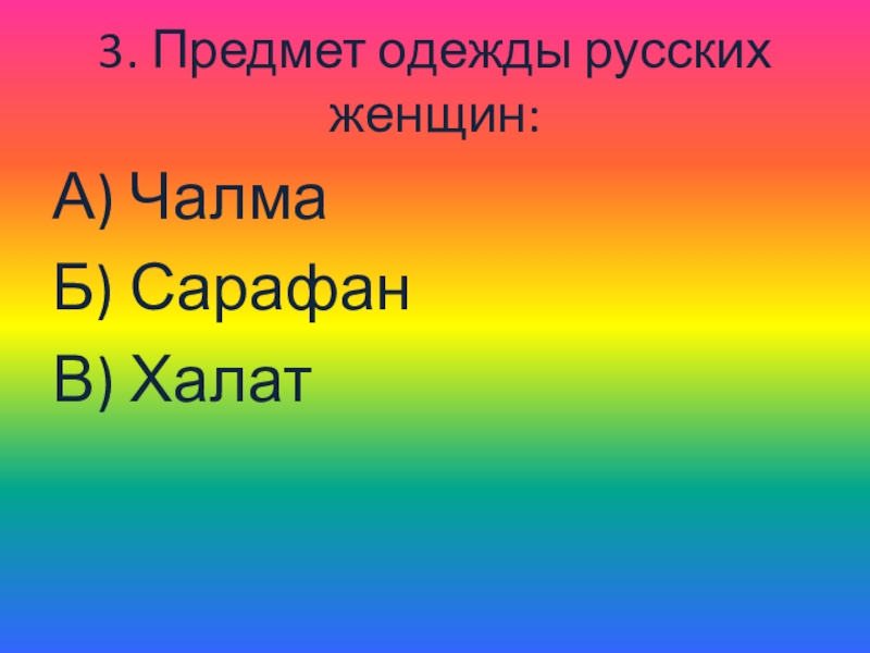 3. Предмет одежды русских женщин:А) ЧалмаБ) СарафанВ) Халат