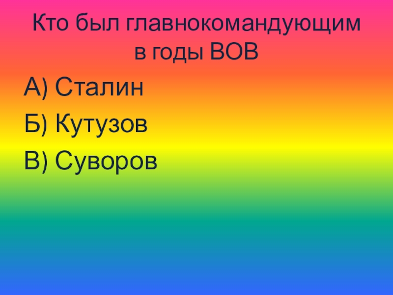 Кто был главнокомандующим в годы ВОВА) СталинБ) КутузовВ) Суворов