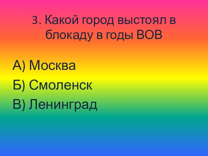 3. Какой город выстоял в блокаду в годы ВОВА) МоскваБ) СмоленскВ) Ленинград