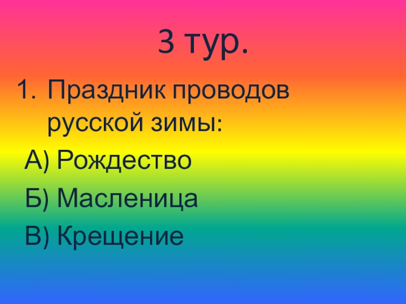 3 тур.Праздник проводов русской зимы:А) РождествоБ) МасленицаВ) Крещение