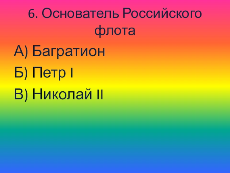 6. Основатель Российского флотаА) БагратионБ) Петр IВ) Николай II