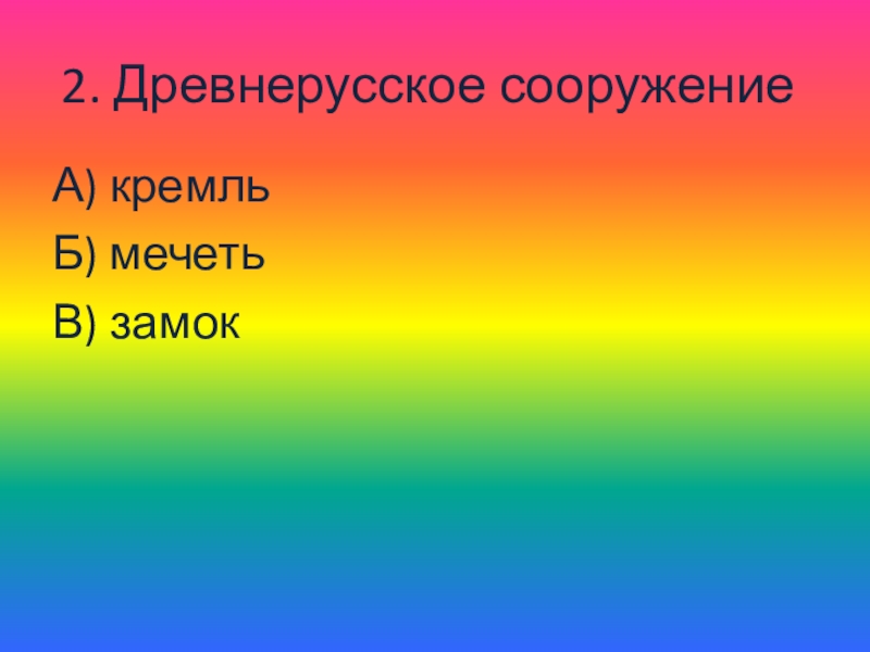 2. Древнерусское сооружениеА) кремльБ) мечетьВ) замок