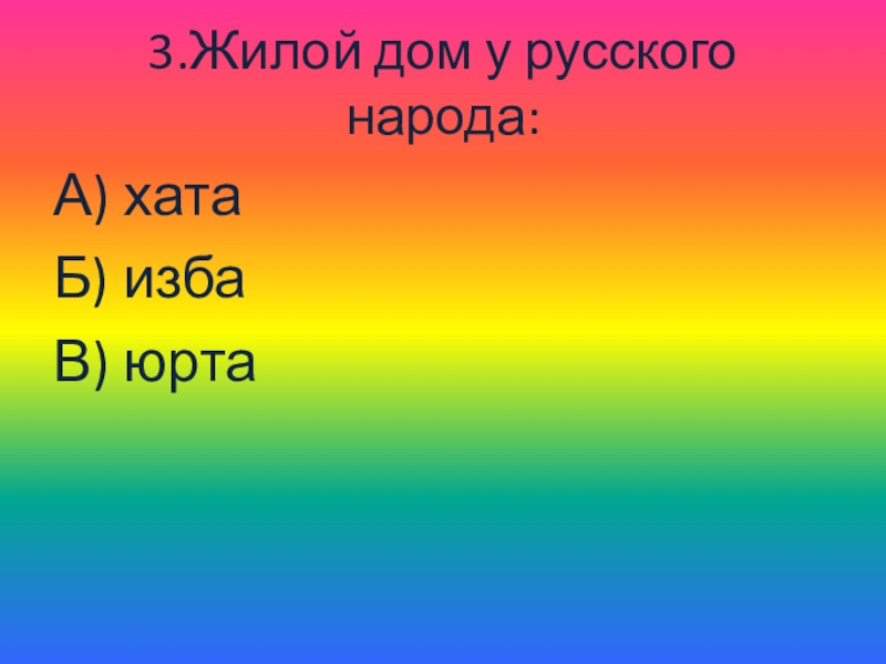 3.Жилой дом у русского народа:А) хатаБ) избаВ) юрта
