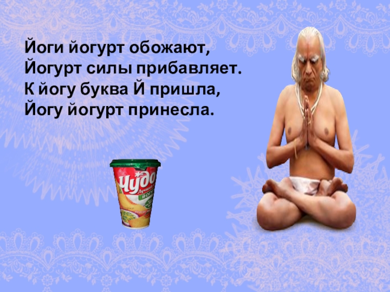 Слайд 7Йоги йогурт обожают, Йогурт силы прибавляет. К йогу буква Й пришла, Йогу йогурт принесла.