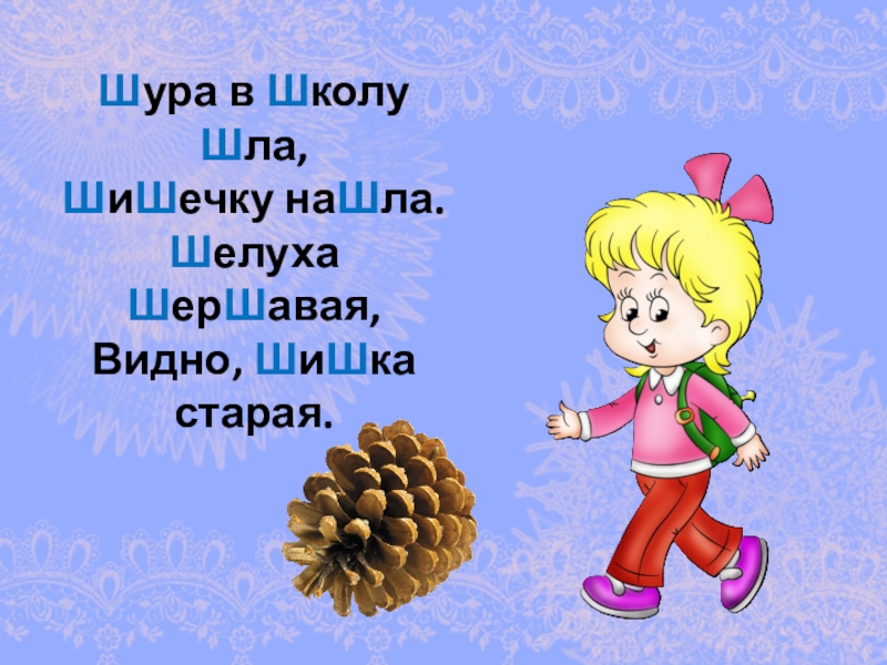 Шура в Школу Шла, ШиШечку наШла. Шелуха ШерШавая, Видно, ШиШка старая.