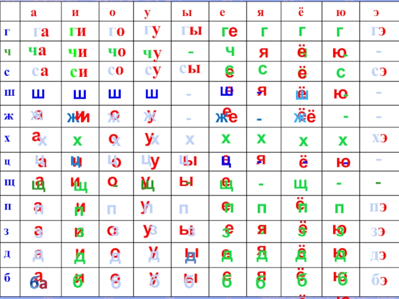 гачасагигогугычичочу-сисосусышашо-шужажижо-жухахихохухыцацицоцуцыщащи-щу-гечесешежехецещепапипопупыпешизазизозузызедадидодудыдезя-ся--хя--пягядябибобубыбебясюсёшёжёхё-щёпёзёдёбёчёгю-гё--хю--пюзюдюбюбэдэзэпэ--хэ--сэ-гэ