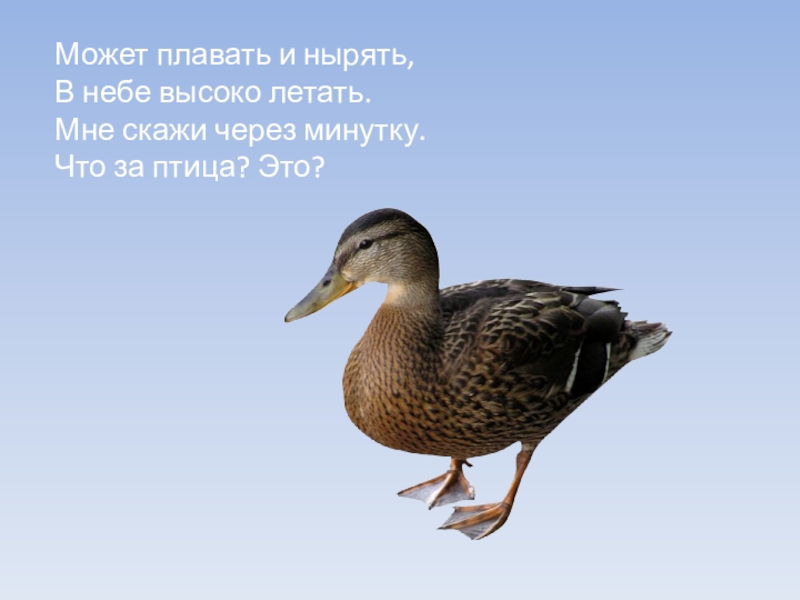 Слайд 8Может плавать и нырять, В небе высоко летать. Мне скажи через минутку. Что за