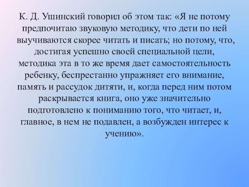 К. Д. Ушинский говорил об этом так: «Я не потому предпочитаю звуковую методику, что дети по ней