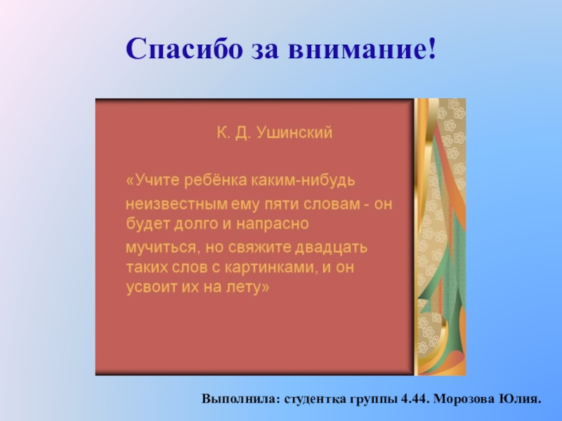 Спасибо за внимание!Выполнила: студентка группы 4.44. Морозова Юлия.