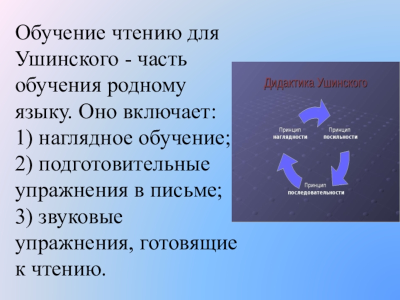 Обучение чтению для Ушинского - часть обучения родному языку. Оно включает: 1) наглядное обучение; 2) подготовительные упражнения