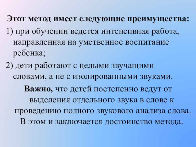 Важно, что детей постепенно ведут от выделения отдельного звука в слове к проведению полного звукового анализа слова. В этом и заключается достоинство метода.