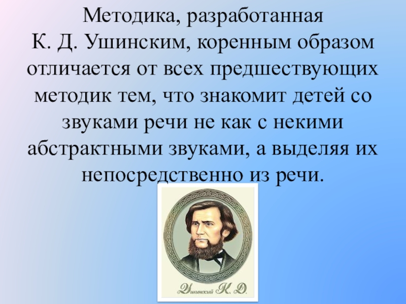 Слайд 3Методика, разработанная К. Д. Ушинским, коренным образом отличается от всех предшествующих