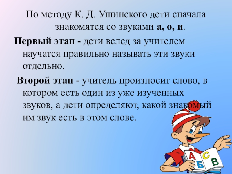 По методу К. Д. Ушинского дети сначала знакомятся со звуками а, о, и. Первый этап - дети