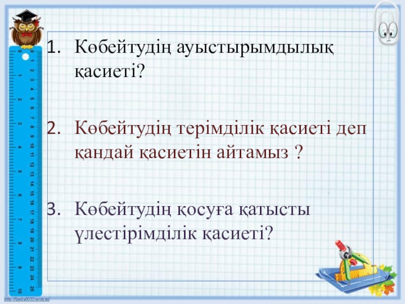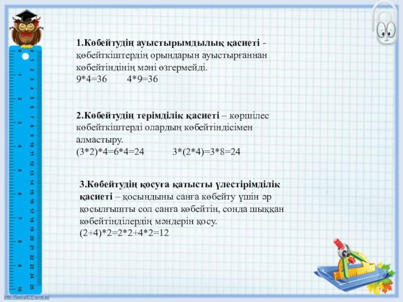 3.Көбейтудің қосуға қатысты үлестірімділік қасиеті – қосындыны санға көбейту үшін әр қосылғышты сол санға көбейтін, сонда шыққан көбейтінділердің мәндерін қосу.