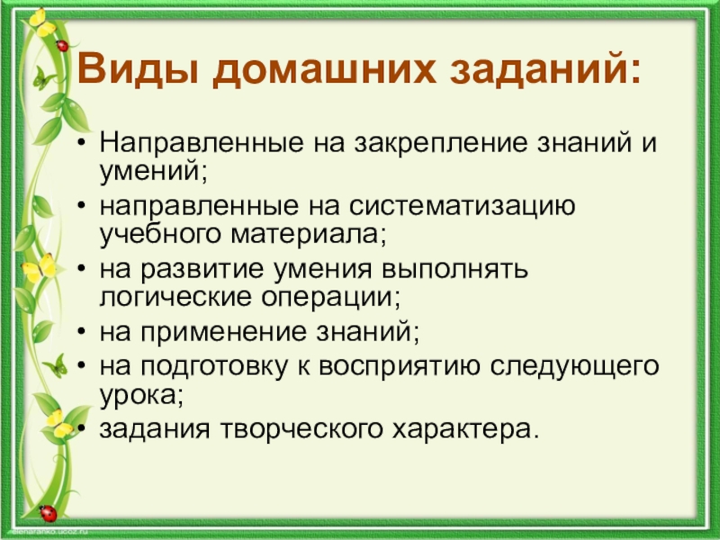 Подобрать различные виды домашних заданий, с учетом индивидуальных особенностей учащихся.