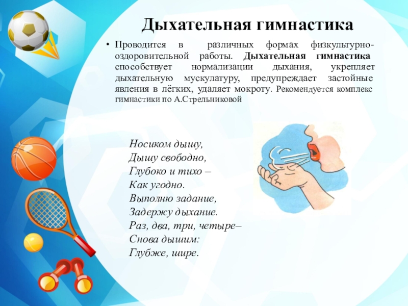 дыхания, укрепляет дыхательную мускулатуру, предупреждает застойные явления в лёгких, удаляет мокроту. Рекомендуется комплекс гимнастики по А.Стрельниковой